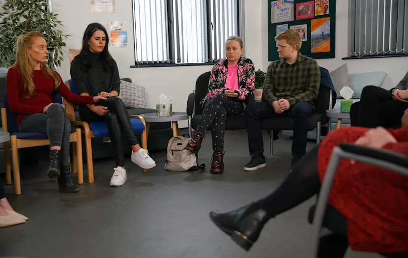 Issue 2: Mental Health. Gemma talks to her post-natal depression group about how she feels useless and worries that she will harm the quads and that she hasn't done any of the milestones that other parents have. One of the other mums tries to reassure her that it will get better. Not for the poor casting director, who'll have to find four lookalikes for the next eighteen years. Gemma says that the group has helped her feel better about herself.