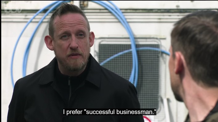 Much of the entire hour is taken up by Eileen's mysterious burglar who left a note to his Mum! Yes Todd is back and wants to meet Eileen in strange lorry park. About 2 minutes after they meet a dodgy skinny individual suddenly appears breaking up the far from warm family re-union. Now I don't want to carp (yes I do). Mick Chaney, the gangster, is not well dressed but has lookouts at Manchester Piccadilly (a main line railway station) watching the comings and goings and spotted Todd on his return to the City. And yet when the "successful businessman" (above) arrives at a car park meet without a single bodyguard, henchman, sidekick or apparently a firearm and then allows Todd to grab a large chunk of wood and knock him down. Well Mick wants Todd dead - Todd stole some of his laundered money.