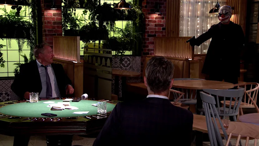 It's a fright night on the street, a Hallowe'en horror as Scott's evil plan, the Weatherfield version of the Hatton Garden Heist, finally takes place. Johnny is, to say the least, unkeen on carrying it out. Scott produces a gun and Johnny, sweating, refuses to go in to the Bistro. He has an MS attack and Scott's true colours are revealed as he refuses to get Johnny's medication and then bashes him with the gun shortly before bursting into the Bistro where Ray and a fellow perv are playing poker and Fay(e) is hostessing. Scott's wearing a mask (not PPE) but master criminal that he is, doesn't think to disguise his voice, for some reason. Johnny calls the po-po, but Craig is already there. He goes in through the back door, just as Scott says he's taking Faye as a hostage and shoots Craig whilst trying to escape.