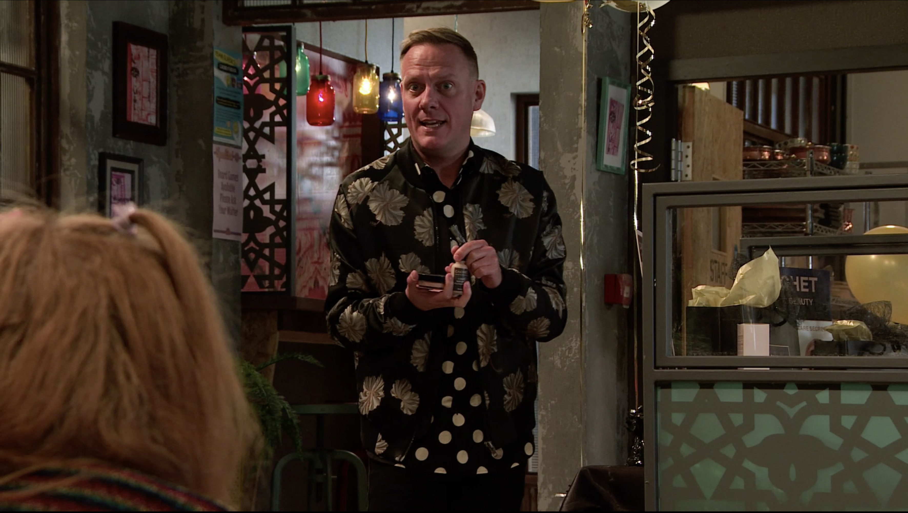Even though we've had this pandemic on for the last eight months, people can just wander into the factory at will - Eileen turns up to tell Sean his make-up has arrived. He and Michael start selling the gunk (I'm pretty sure we had this story before when Sinead was alive), but they have different ways of doing things Michael goes door to door whilst Sean throws an Avon style party with Todd, Tyrone, Fiz, Alina and Gemma. When is Weatherfield moving into Tier 3? After having a make-over, Tyrone buys some (but for Fiz, not him).