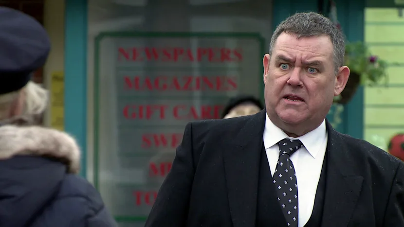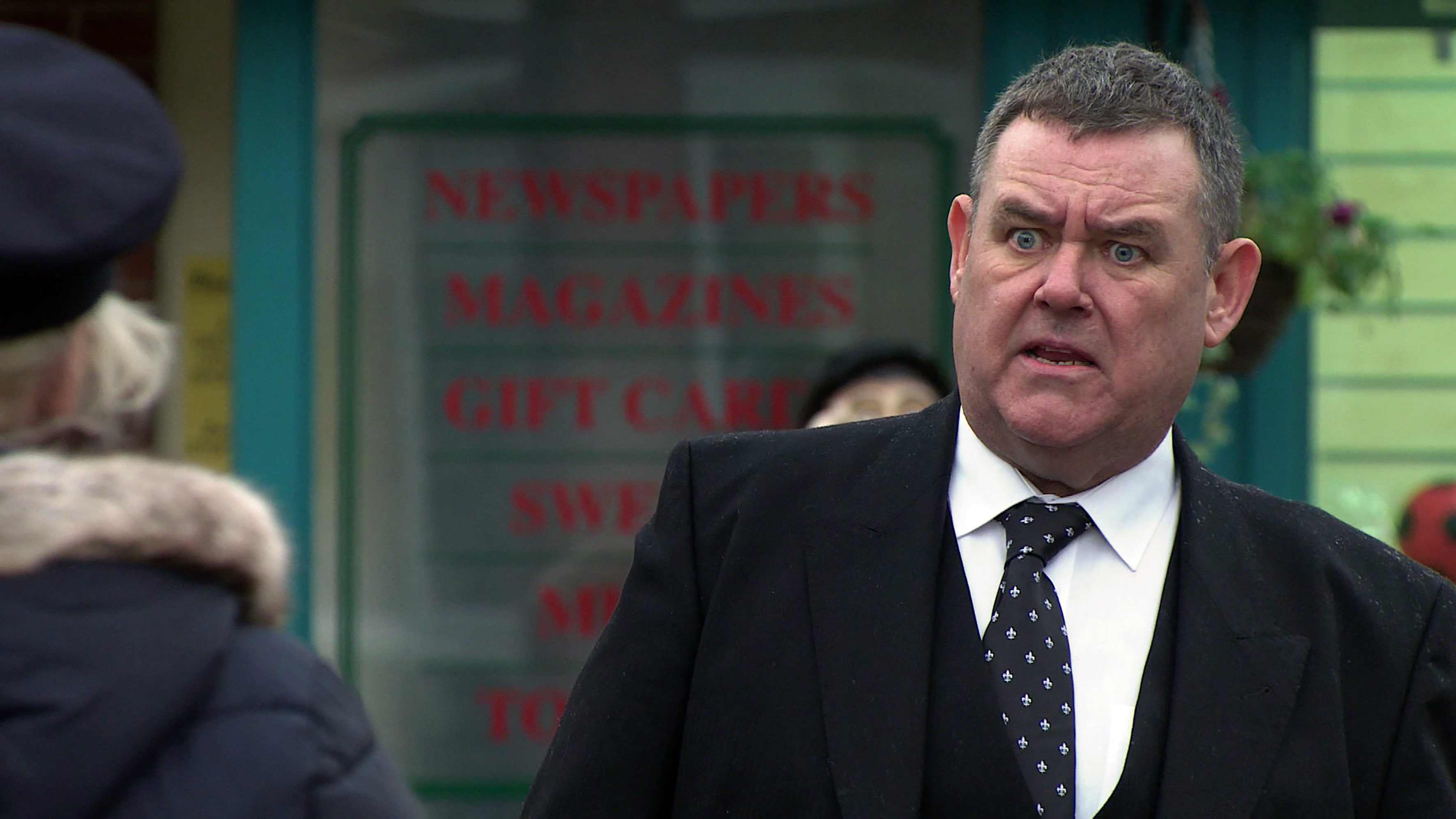 The comedy storyline involves Steve, Tim, Eileen, George and a hearse. Tim and Steve argue over who gets to drive the hearse:- Steve does a Lewis Hamilton around the cobbles and so Tim wins the funereal driving test. They then have to be inspected by Eileen in their dark suits and told to take things a bit more seriously. They do not do this, instead they take the p out of Eileen for her crush on George. Are Gorgeous George and Eileen going to get together? Although Peter could soon be single and Eileen likes a car crash.