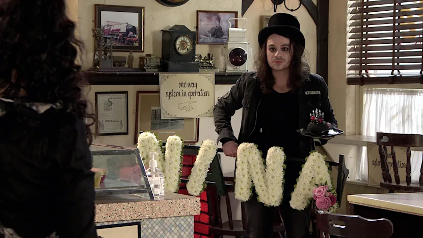 George is busy helping Seb woo Nina with some second hand flowers (changing Nana to Nina). Seb gets dressed up as a Victorian professional mourner (although he looks a bit like Mick Jagger in Performance) to present it to her. Nina is not impressed and tells him to sling his hook. However, they later make up when she explains her gothdom to him and then asks him to move in.