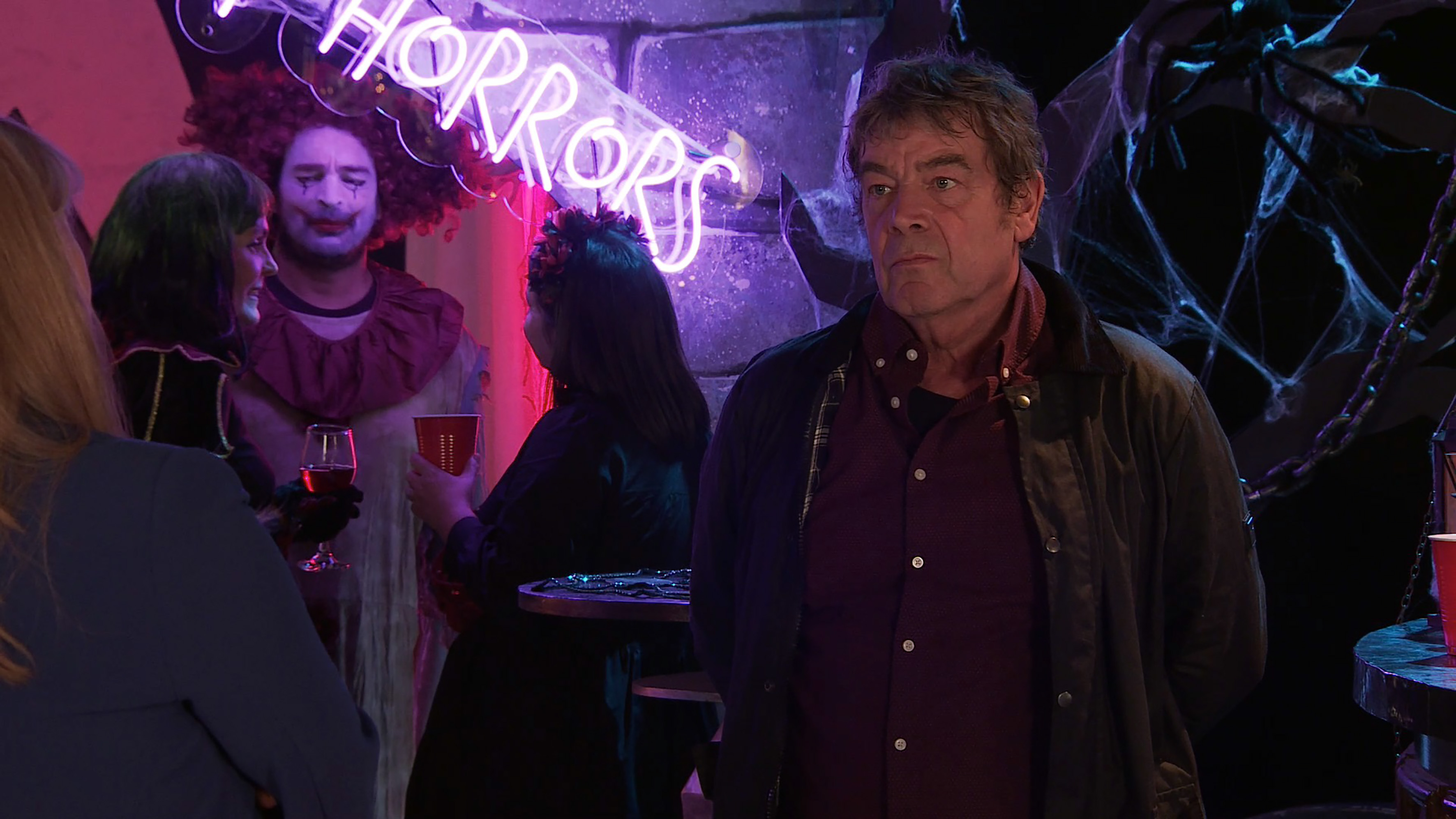 Sam, Nick and Shona preview the haunted house, featuring Kirk as a mummy in a coffin. Sam asks why he isn't in a sarcophagus and asks what dynasty Kirk is from. Trust the nerd to ruin everything. Nick persuades Leanne to dress up as Morticia, which is not a sex game, but to replace Natasha who is stuck on the motorway, for her and Sam's mum 'n' son costume.