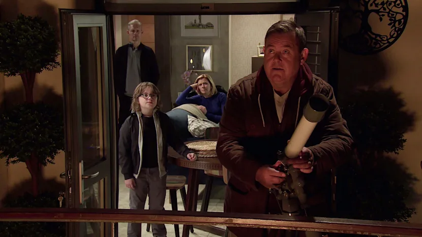 George brings 'round his old telescope as an attempt to get Sam to speak again (to be honest, it's nice to have a bit of a break from Sam's endless science nerd prattle. Also, I do wish TV Burp was still on so they could compile a montage of Sam marching out of the room whenever anyone speaks to him). Nick knocks over and breaks Sam's memory jar, which upsets him. Should've got a tupperware one.