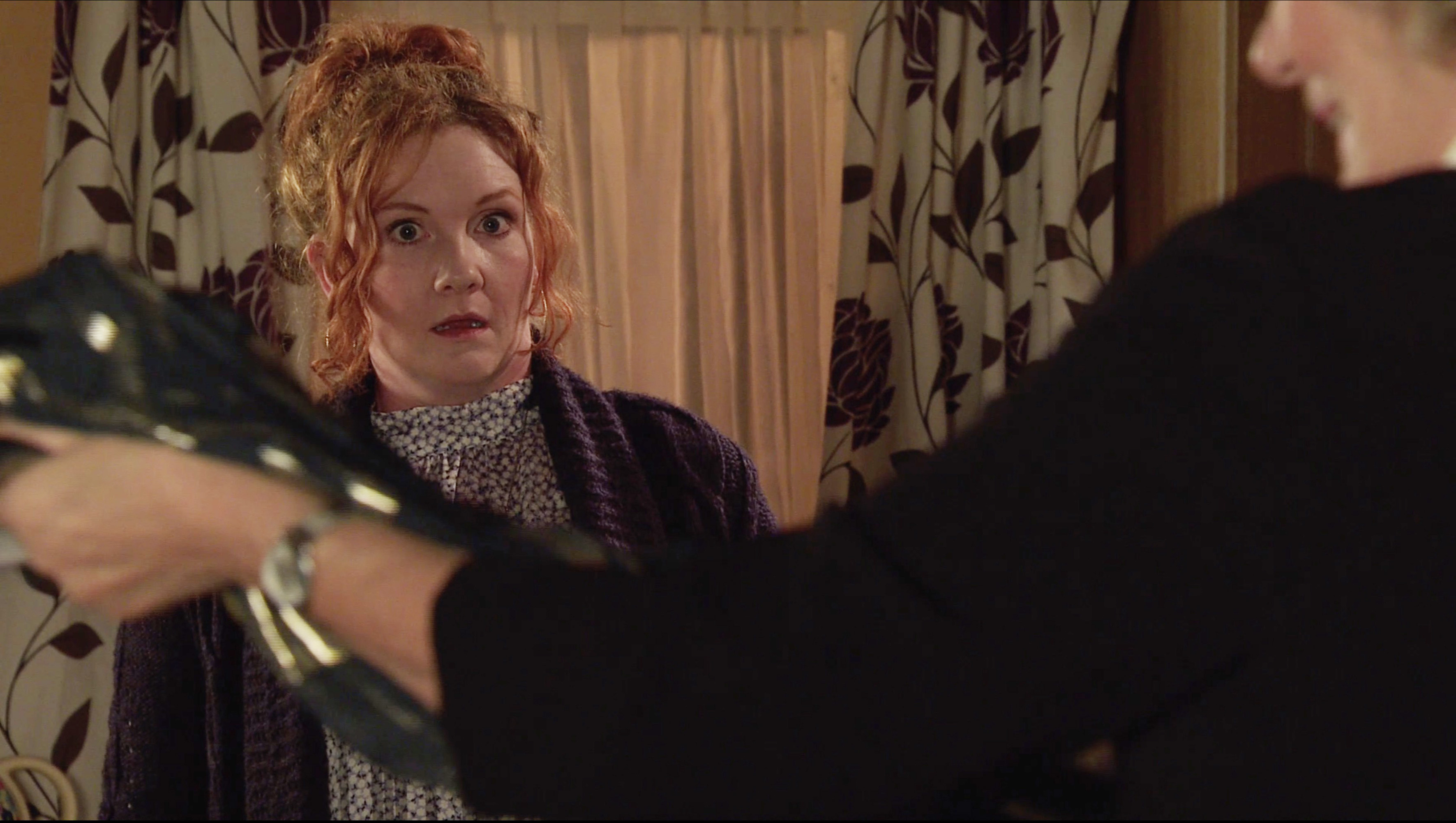 How much do I love Mimi? Let me count the ways. One, her overbearing ways explains Phil(l)'s general sappiness; two, her magnificent snobbery and fabulous dress sense; three, she gets on with Sally like a Speed Daal on fire, and four, she's a good (temporary) replacement for Dame Maureen of Lipman, who seems to be on holiday. Mimi goes shopping for some party dresses for the girls (fabulous in taffeta) and for Fiz, an off the shoulder number in sparkly teal. It's very nice and Fiz is supremely ungrateful. Mimi, you can be my mother in law anytime. Fiz complains to Tyrone about Mimi and Phil(l) and Tyrone surprisingly bigs up Phil(l) and tells the Fizzster that Phil(l) intends to take her and the girls away for Christmas. We'll see, shall we?