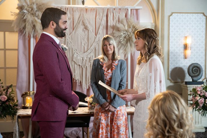 Toyah has found an Edwardian wedding frock in an antique shop (au contraire, Leanne looks very hot in a shoulder-less green number) whilst Imran gets gin thrown all over his maroon suit when Abi discovers what Imran is up to. Worse is to come when Abi kidnaps Toyah to try and talk her out of marrying Immers. It doesn't work though as Toyah and Imran get wed in the glamorous environs of the Chariot Hotel.