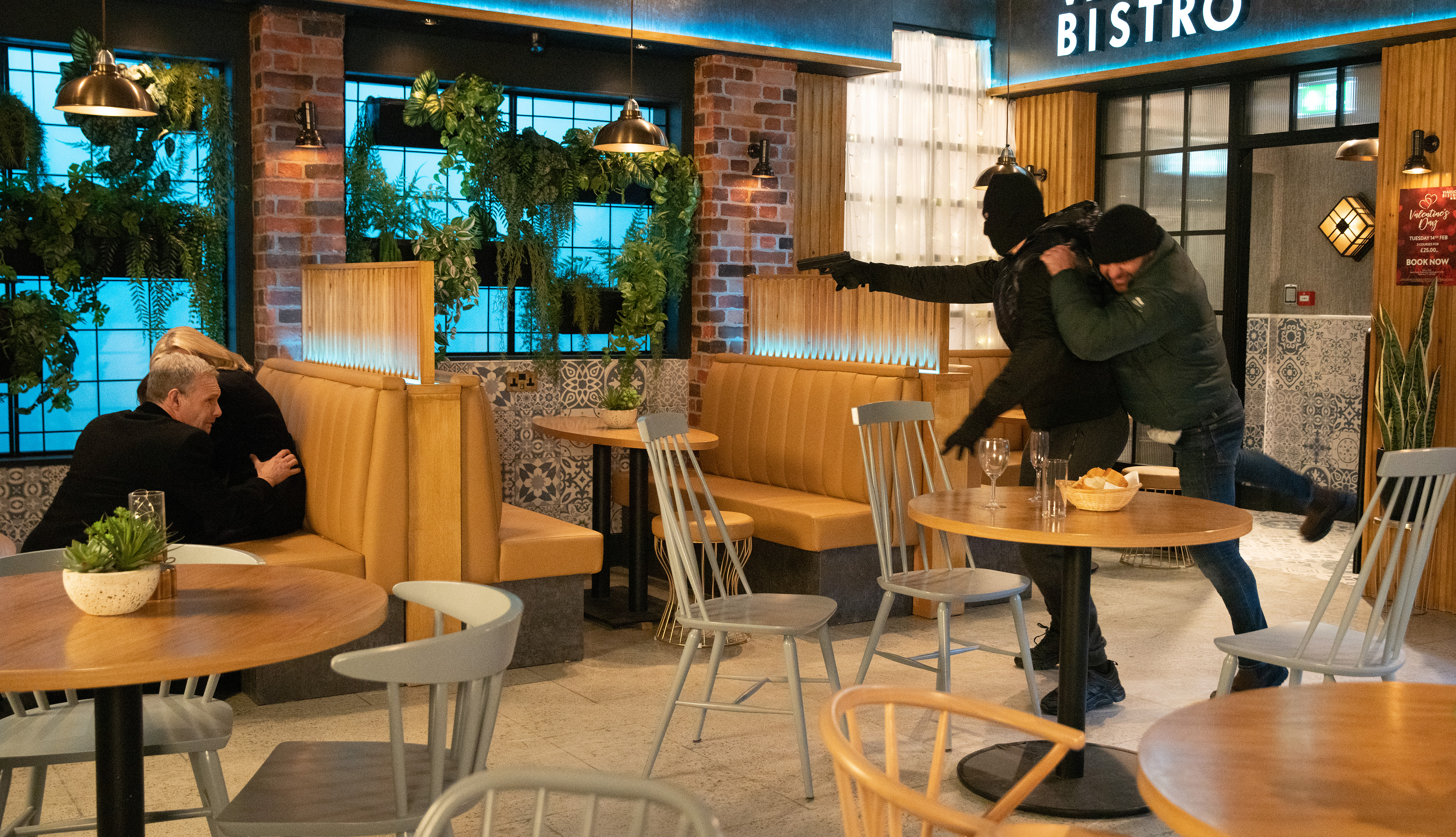 Anyway, Nick has other things on his mind, namely a) Leanne being mad at hm (Jane Danson is so good at being angry) and b) the Bistro being turned into Pablo Escobar's drugs den. He wants Damon to remove them but before he can, masked men burst into the Bistro and demand that Ryan HAND OVER THE DRUGS. Ryan, bless his little heart, stays calm and denies there are any illegal substances on site. Nick and Leanne arrive and instead of giving over the drugs like any sane person hide under the table with Same It's only Ryan who deals with the panicked customers who are not going to give the Bistro a five star review on Tripadvisor, not unless they get a free desert anyway. Give Ryan a Pride of Weatherfield award. Damon rugby tackles the rival Gunchester gangstas and the po-po arrive, fortunately not with Tinker of the yard. Damon has somehow managed to spirt the drugs away and now wants Nick to hide them in Victoria Court. It's no wonder Leanne is so furious, to become an accidental drug dealer for the Gaskell family once is unfortunate, to do it twice looks careless.