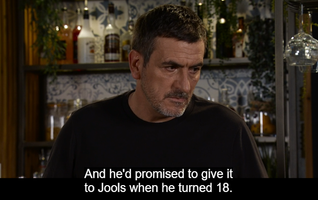 Lou also mentions to Carla, as Peter arrives, that she simply cannot find the watch which was his pride and joy and which is promised to Jools, their son, when he is 18. Once Lou has gone Peter recalls finding the watch in the back of his cab, pawning it for £15k which paid for Carla's rehab when Uncle Stephen was more than microdosing her beverages with LSD! Whoops. Carla suggests to Peter that he should explain to Lou and that is the best way of making it right.